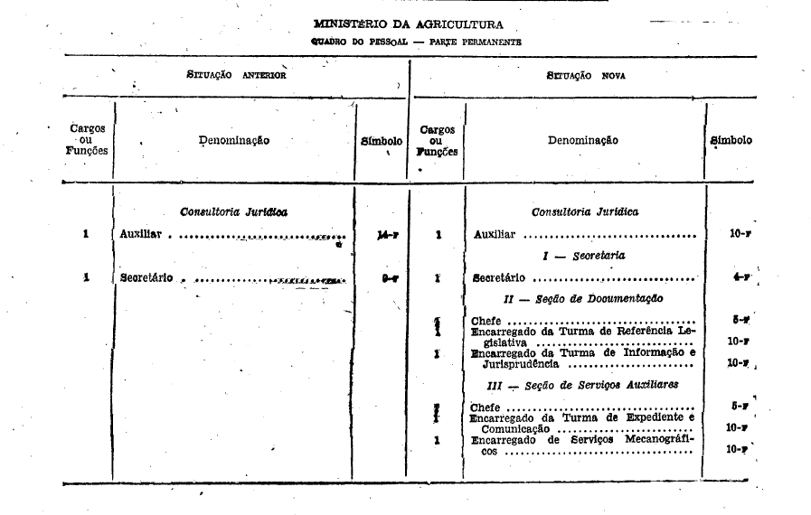 Art. 2º Ficam reclassificadas respectivamente, nos símbolos 10-P e 4-F, as funções gratificadas de Auxiliar e Secretário da Consultoria Jurídica do Ministério da Agricultura, constante da tabela anexa ao