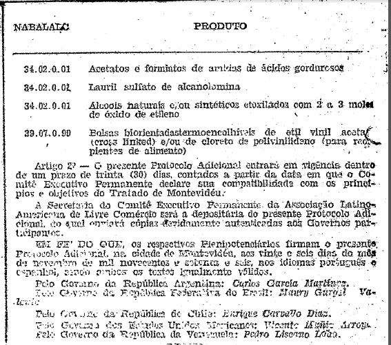 CONSIDERANDO que o tratado de Montevidéu, que criou a Associação Latino-Americana de Livre Comércio, e foi firmado pelo Brasil em 18 de fevereiro de 1960 e aprovado pelo Congresso Nacional através do Decreto Legislativo nº 1, de 3 de fevereiro de 1961, prevê, no seu artigo 16, a celebração de Ajustes de Complementação por setores industriais, matéria essa regulamentada pela Resoluções 15 (I), 16 (I) e 99 (IV) da Conferência das Partes Contratantes do Tratado;