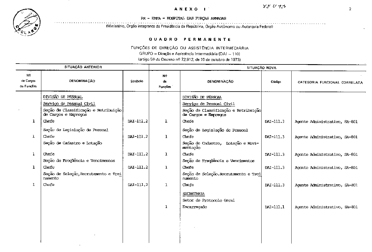 O PRESIDENTE DA REPÚBLICA , usando da atribuição que lhe confere o artigo 81, item III, da Constituição, e tendo em vista o disposto nos artigos 7º e 8º da Lei nº 5.645, de 10 de dezembro de 1970, na Lei nº 6.006, de 19 de dezembro de 1973, no Decreto nº 72.912, de 10 de outubro de 1973, no Decreto nº 77.629, de 18 de maio de 1976, e o que consta do Processo DASP nº 24.862, de 1982,