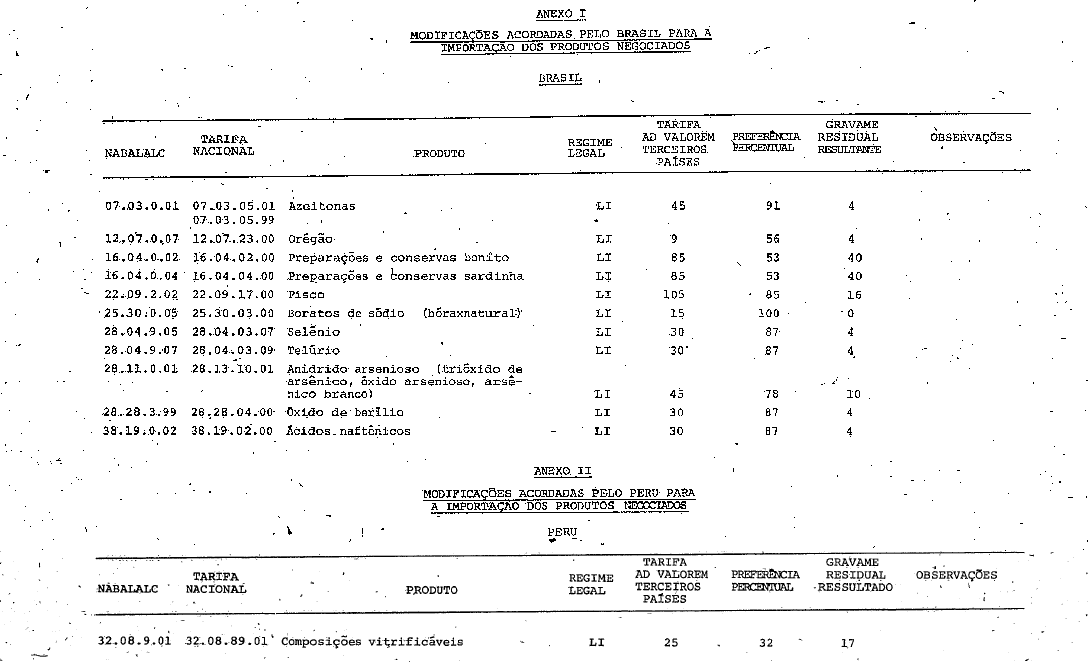 Artigo 1º, A partir de 7 de novembro de 1983, as importações dos produtos especificados no Anexo I do presente Protocolo Adicional, originárias do Peru, ficam sujeitas aos gravames estipulados no mencionado Anexo, que passa a constituir parte integrante do Acordo de Alcance Parcial nº 12, subscrito entre o Brasil e o Peru, em 30 de abril de 1983, e posto em vigor, no Brasil, pelo Decreto nº 88.646, de 23 de agosto de 1983.