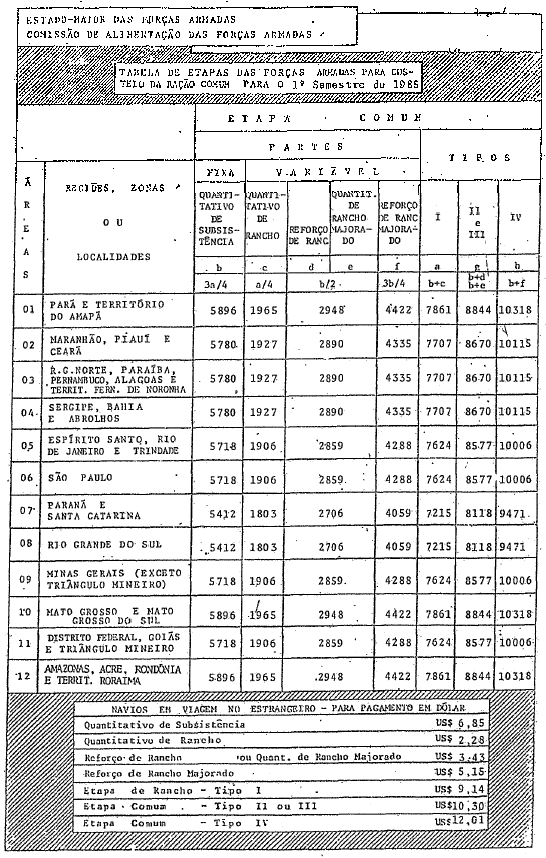 Aprova as Tabelas de Etapas, dos Complementos da Ração Comum e do Quantitativo das Rações Operacionais das Forças Armadas para o Primeiro Semestre de 1985.