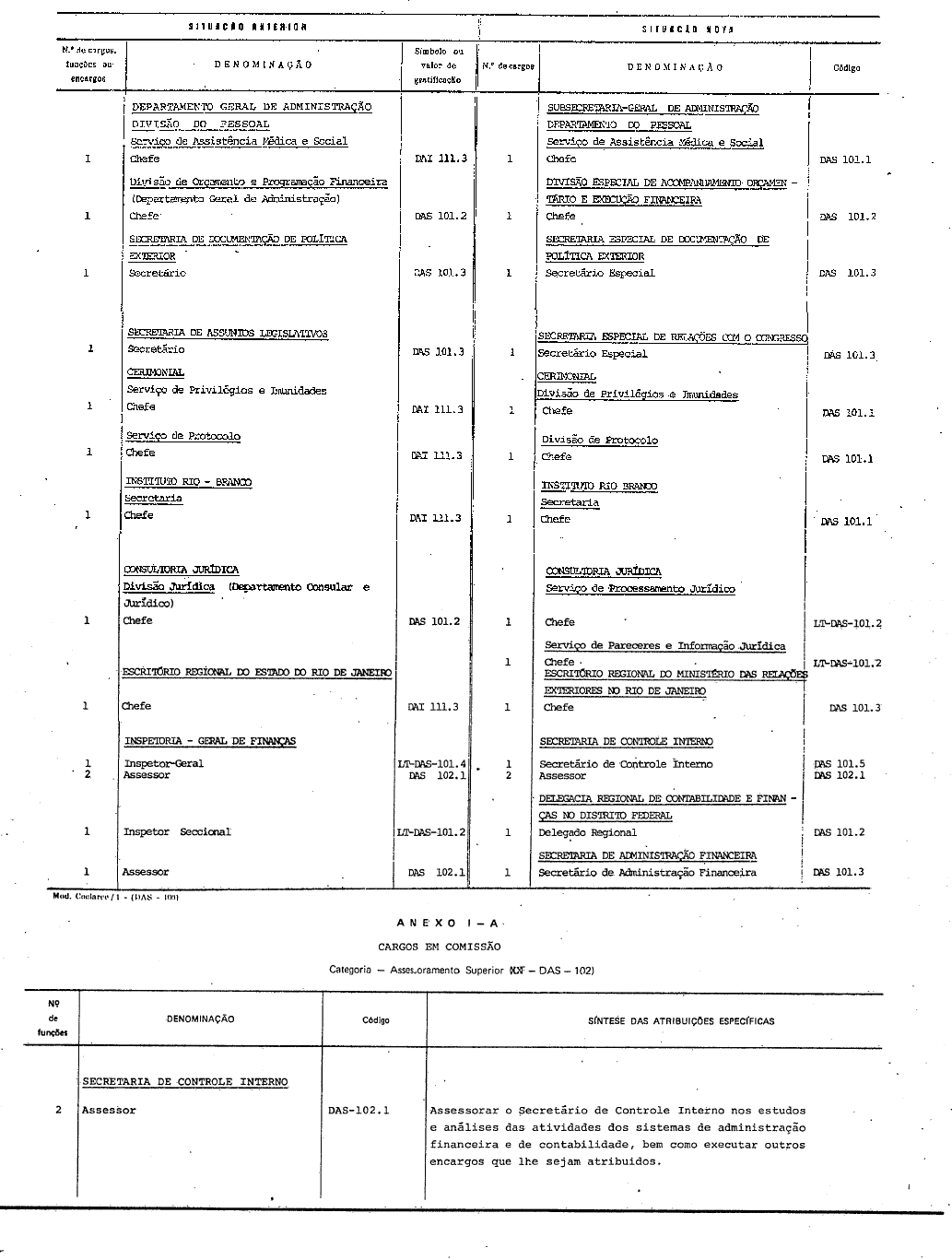 Art . 1º, Ficam transformados cargos em comissão e funções de confiança dos Grupos DAS e DAI, bem como um cargo em comissão em função de confiança e, criada uma função de confiança, na forma do Anexo I deste decreto, para composição das Categorias Direção Superior, código DAS-101, e Assessoramento Superior, código DAS-102, do Grupo-Direção e Assessoramento Superiores, código DAS-100, do Quadro Permanente do Ministério das Relações Exteriores.