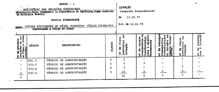 Art . 1º, Ficam criadas, na forma do Anexo I deste decreto, na categoria funcional de Técnico de Administração, do Grupo: Outras Atividades de Nível Superior, Código: LT-NS-900-, da Tabela Permanente do Ministério das Relações Exteriores, 2 (dois) empregos a serem preenchidos por candidatos habilitados em concurso público.