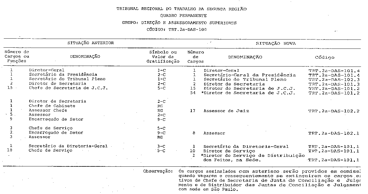 Art. 1º Aos níveis de classificação dos cargos de provimento em comissão, são integrantes do Grupo-Direção e Assessoramento Superiores, código TRT.2ª-DAS-100, do Quadro Permanente da Secretaria do Tribunal Regional do Trabalho da Segunda Região, estruturado nos termos da Lei nº 5.645, de 10 de dezembro de 1970, correspondem os seguintes vencimentos: