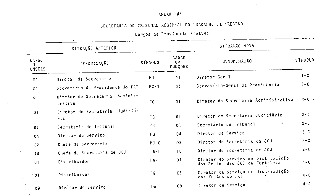 Art. 4º Os vencimentos dos cargos em comissão do Quadro de Pessoal da Secretaria do Tribunal Regional do Trabalho da Sétima Região, constantes do Anexo A, são os fixados para os símbolos correspondentes aos do Poder Executivo, observado o princípio estabelecido nos §§ 1º e 2º, do artigo 1º, da Lei nº 4.345, de 26 de junho de 1964.