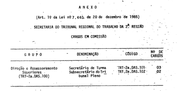 Art. 1º - Ficam criados, no Quadro Permanente da Secretaria do Tribunal Regional do Trabalho da 2ª Região, os cargos em comissão constantes do Anexo I desta Lei.