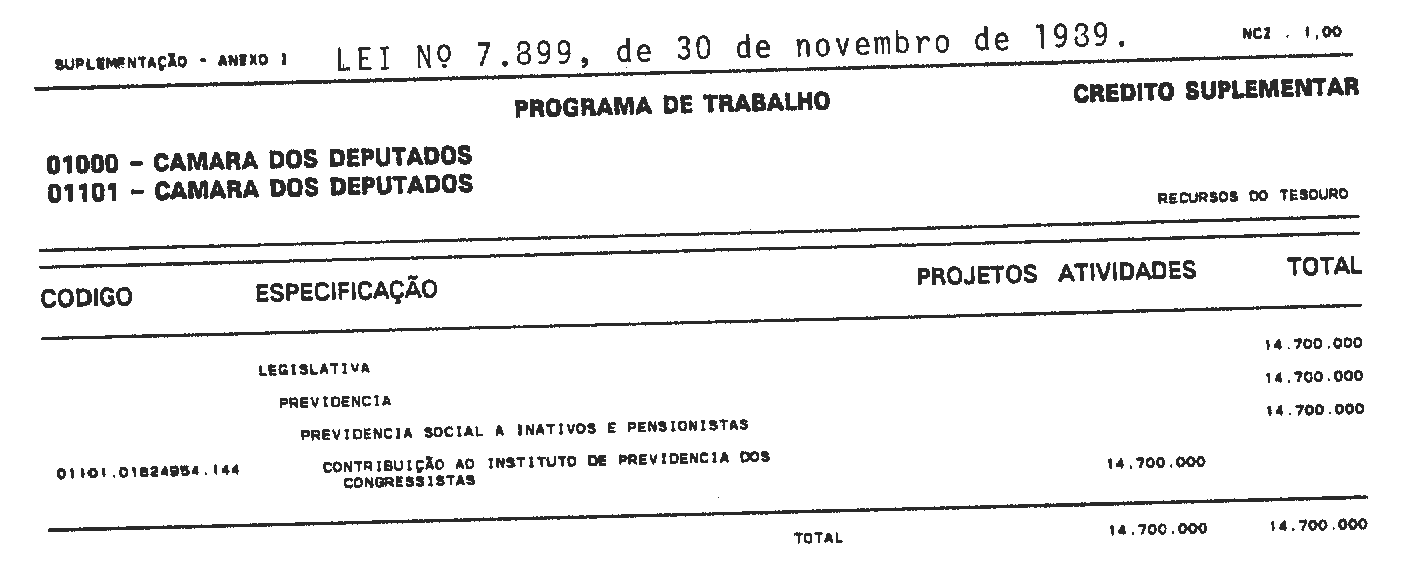 Autoriza o Poder Executivo a abrir ao Orçamento fiscal da União créditos suplementares até o limite de NCz$ 46.000.000,00, em favor do Poder Legislativo, para os fins que especifica.