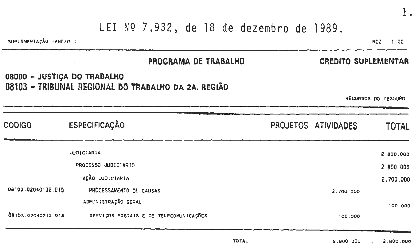 Art. 1° É o Poder Executivo autorizado a abrir ao Orçamento Fiscal da União (Lei n° 7.715, de 3 de janeiro de 1989), Anexo II, crédito suplementar até o limite de NCz$ 2.800.000,00 (dois milhões e oitocentos mil cruzados novos), em favor da Justiça do Trabalho, de conformidade com a programação constante do Anexo I, desta Lei.