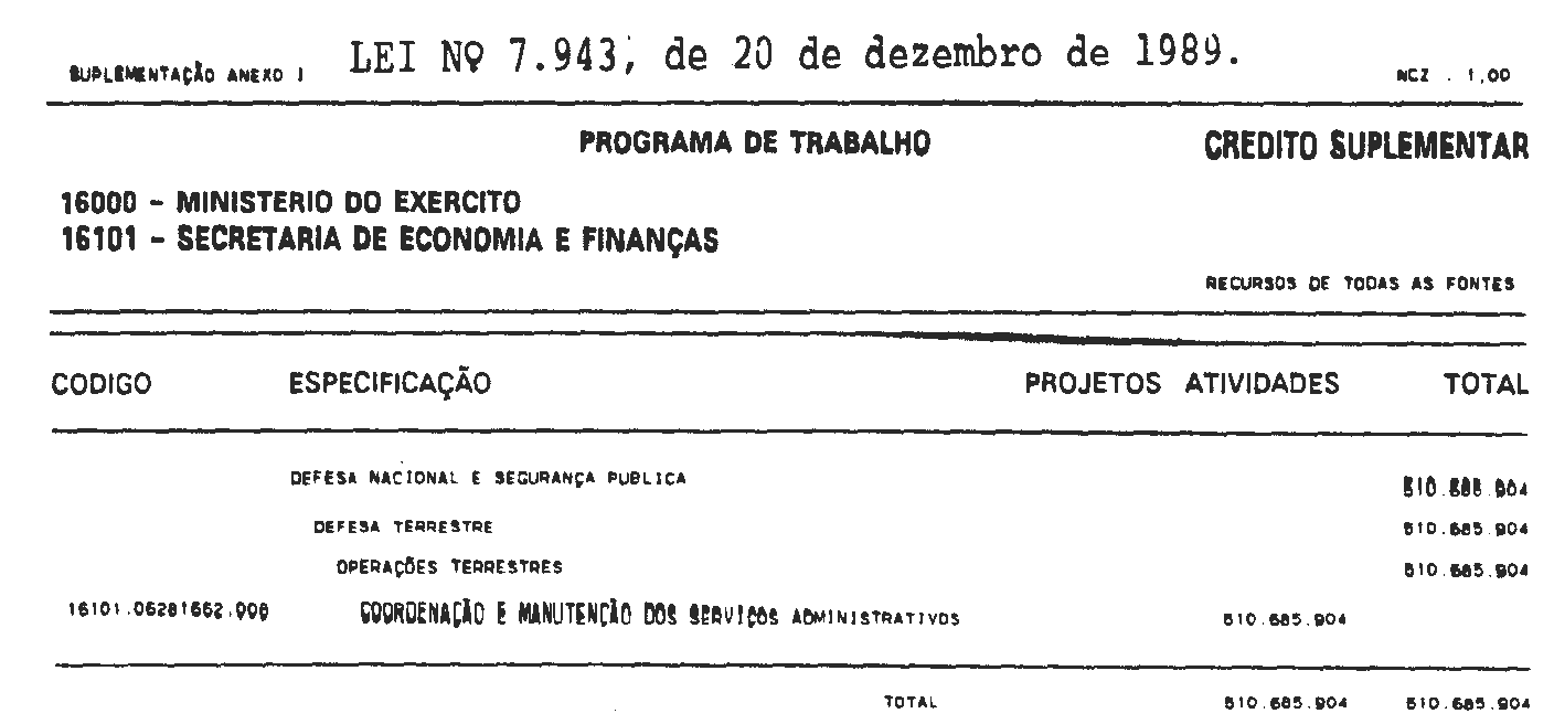 Art. 1º É o Poder Executivo autorizado a abrir ao Orçamento Fiscal da União (Lei nº 7.715, de 3 de janeiro de 1989), Anexo II, o crédito suplementar até o limite de NCz$ 510.685.904,00 (quinhentos e dez milhões, seiscentos e oitenta e cinco mil e novecentos e quatro cruzados novos), de conformidade com a programação constante do Anexo I desta Lei.