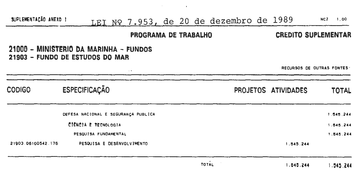 Art. 1º É o Poder Executivo autorizado a abrir ao Orçamento Fiscal da União (Lei nº 7.715, de 3 de janeiro de 1989), Anexo IV, o crédito suplementar, até o limite de NCz$ 1.545.244,00 (um milhão, quinhentos e quarenta e cinco mil e duzentos e quarenta e quatro cruzados novos), de conformidade com a programação constante do Anexo I desta Lei.