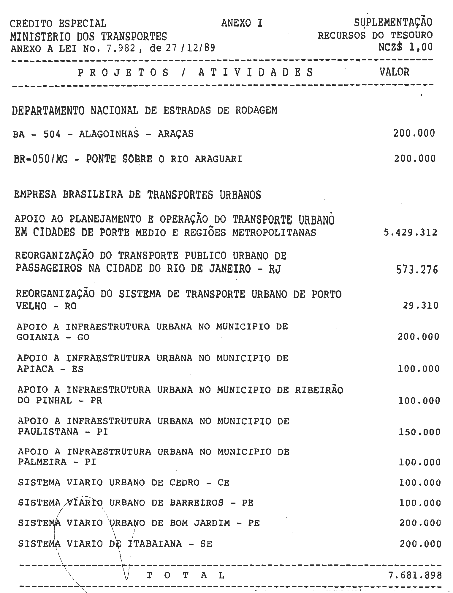 Autoriza o Poder Executivo a abrir ao Ministério dos Transportes, crédito especial até o limite de NCz$7.681.898,00, para os fins que especifica. |
