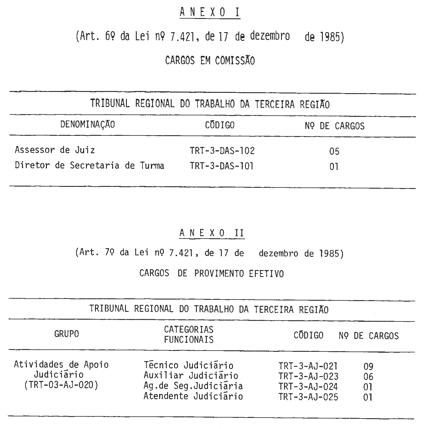 Art. 7º - Ficam criados, no Quadro Permanente de Pessoal do Tribunal Regional do Trabalho da Terceira Região, os cargos de provimento efetivo constantes do Anexo II desta Lei.