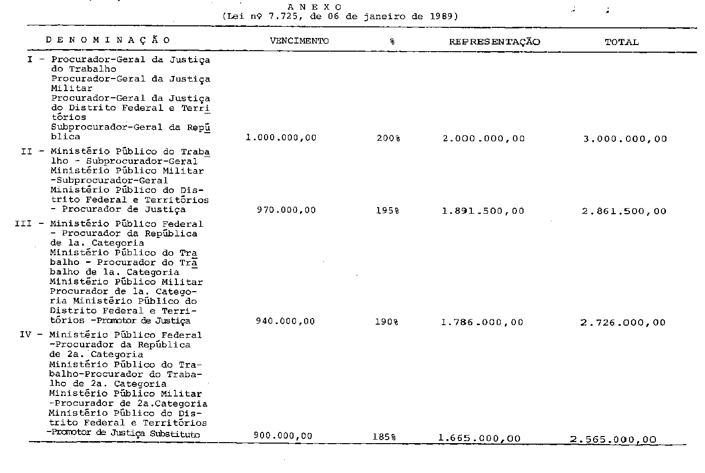 Art. 1º A remuneração e a verba de representação devidos aos Membros do Ministério Público Federal, Ministério Público do Trabalho, Ministério Público Militar e Ministério Público do Distrito Federal e Territórios, a partir de 1º de novembro de 1988, passam a ser as constantes do Anexo desta Lei.