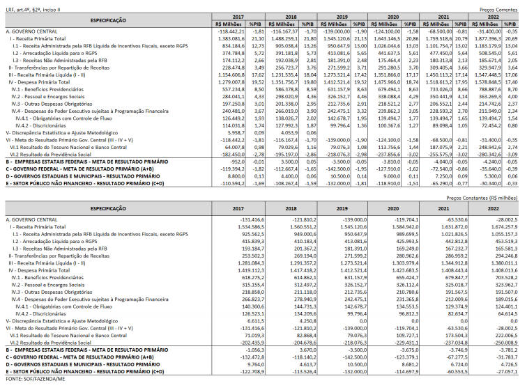“Art. 2º A elaboração e a aprovação do Projeto de Lei Orçamentária de 2020 e a execução da respectiva Lei deverão ser compatíveis com a obtenção da meta de deficit primário de R$ 124.100.000.000,00 (cento e vinte e quatro bilhões e cem milhões de reais) para os Orçamentos Fiscal e da Seguridade Social e de R$ 3.810.000.000,00 (três bilhões oitocentos e dez milhões de reais) para o Programa de Dispêndios Globais, conforme demonstrado no Anexo de Metas Fiscais constante do Anexo IV a esta Lei.