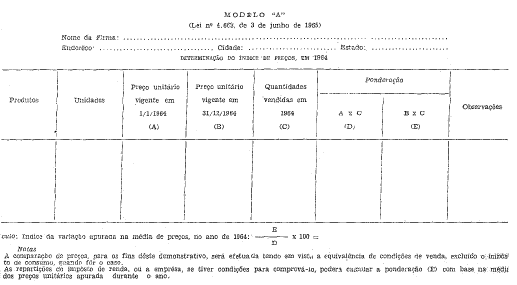 § 1º Ficam também dispensadas da elaboração do demonstrativo previsto no anexo modêlo “A” as emprêsas que, pela simples listagem dos preços unitários de venda de seus produtos demonstrarem que nenhum dêles sofreu aumento superior a 10% (dez por cento), entre 28 de fevereiro e 31 de dezembro de 1965, ou que declararem haver aumentado o preço médio de vendas, durante o ano de 1964, em mais de 86% (oitenta por cento).