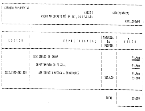 Abre ao Ministério da Saúde em favor do Departamento de Pessoal, o crédito suplementar no valor de Cr$ 33.500.000,00, para reforço de dotação consignada no vigente Orçamento. |