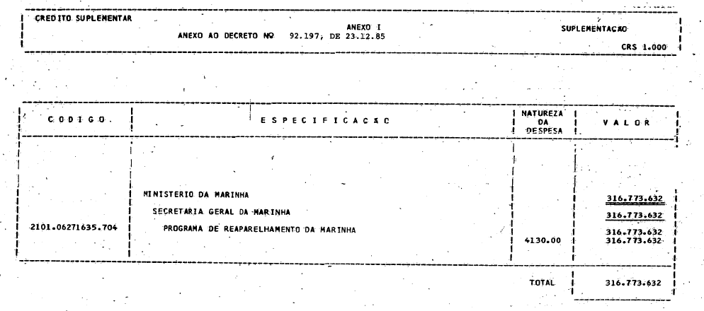 Art.1º - Fica aberto ao Ministério da Marinha, em favor da Secretaria Geral da Marinha, o crédito suplementar no valor de Cr$ 316.773.632.000 (trezentos e dezesseis bilhões, setecentos e setenta e três milhões, seiscentos e trinta e dois mil cruzeiros), para reforço das dotações orçamentárias indicadas no anexo I deste Decreto.