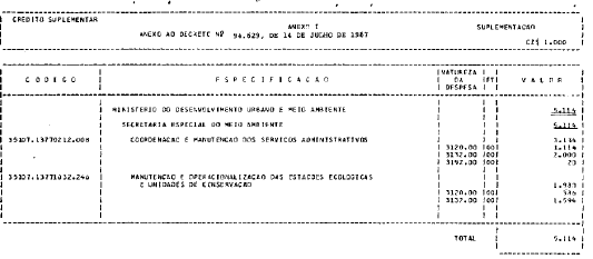 da Secretaria Especial do Meio Ambiente, o crédito suplementar de CZ$