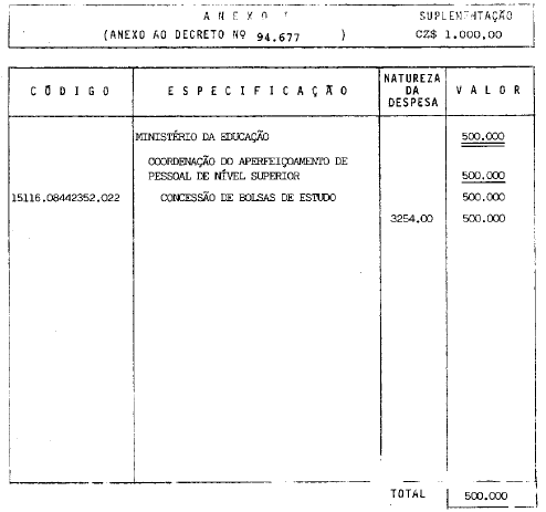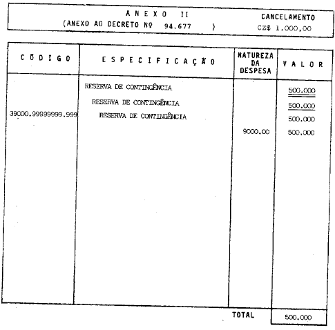 suplementar de CZ$ 500.000.000,00 (quinhentos milhões de cruzados), para reforço