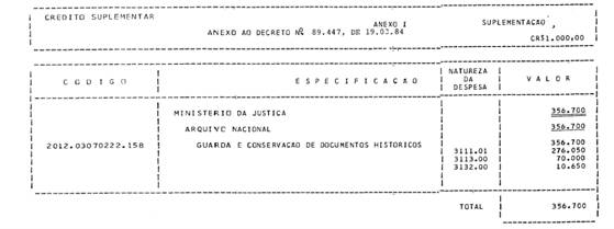 Art. 1º - Fica aberto ao Ministério da Justiça, em favor de Arquivo Nacional, o crédito suplementar no valor de Cr$ 356.700.000,00 (trezentos e cinqüenta e seis milhões e setecentos mil cruzeiros), para reforço de dotações orçamentárias indicados no anexo I deste Decreto.