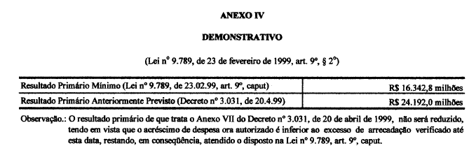 "Art. 1º Ficam limitados a R$ 36.668.519.000,00 (trinta e seis bilhões, seiscentos e sessenta e oito milhões, quinhentos e dezenove mil reais) a movimentação e o empenho das dotações orçamentárias dos órgãos do Poder Executivo, dos grupos "outras despesas correntes", "investimentos" e "inversões financeiras", constantes da Lei nº 9.789, de 23 de fevereiro de 1999, conforme estabelecido nos arts. 2º e 6º deste Decreto.