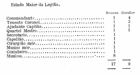 A Legião será composta de um Estado Maior, de um Corpo de Caçadores a pé, e de outro de Caçadores a cavalo.