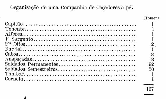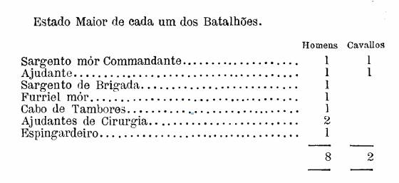 O Corpo de Caçadores a pé constará de tres Batalhões, cada Batalhão terá um Estado Maior e quatro Companhias.