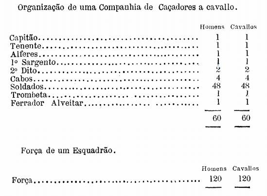 O Corpo de Caçadores a cavallo terá um Estado Maior, e será de dous Esquadrões, cada um de duas Companhias.