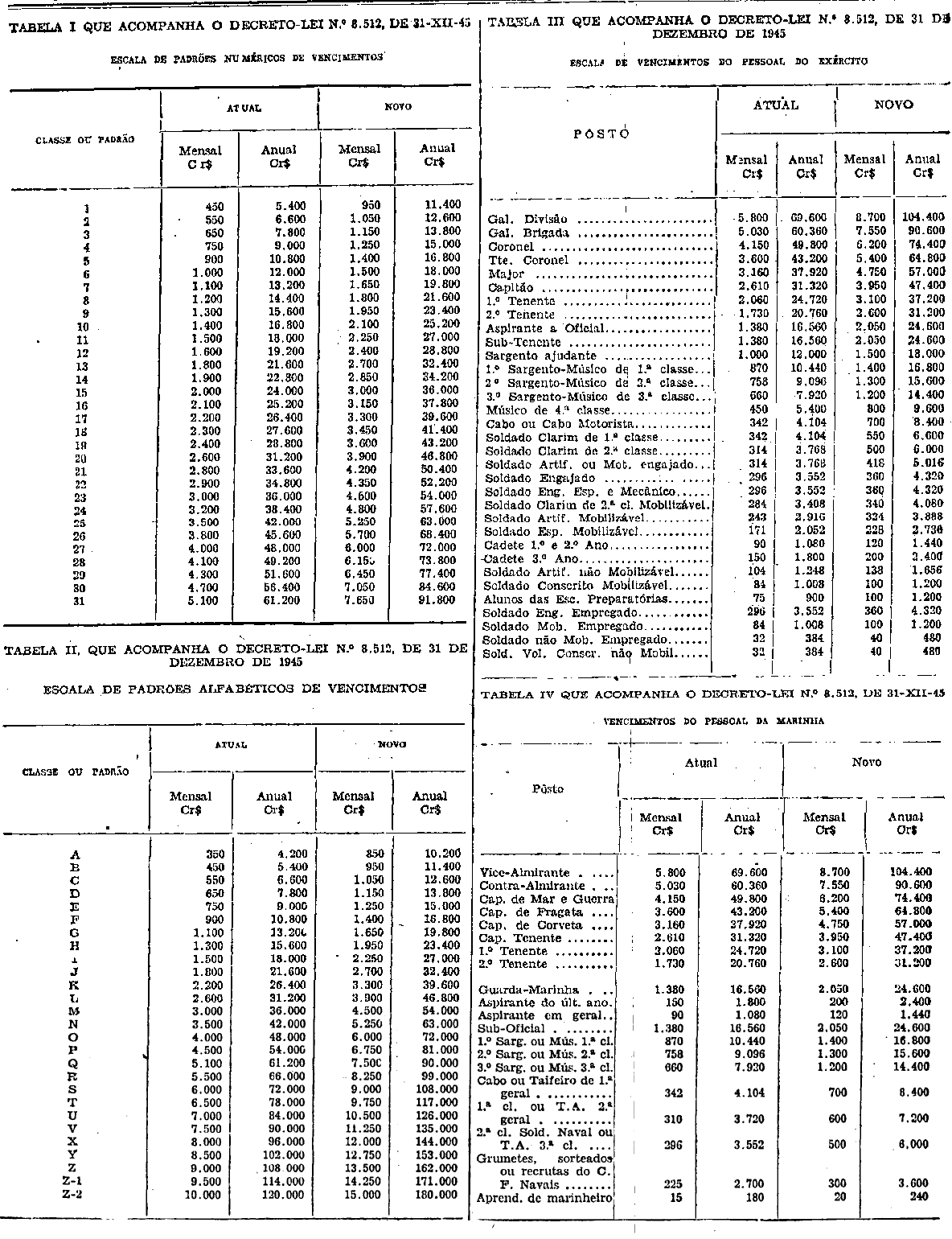 Art. 2º Ficam elevados os vencimentos do pessoal militar da ativa, do Exército da Armada e da Aeronáutica bem como da Polícia Militar e do Corpo de Bombeiros do Distrito Federal, na conformidade das tabelas anexas (III, lV, V, Vl e VII).