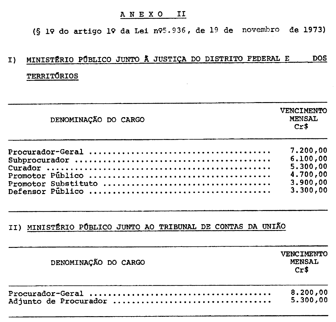 § 1º Os vencimentos dos membros do Ministério Público junto a Justiça do Distrito Federal e dos Territórios e junto ao Tribunal de Contas da União são os constantes do Anexo II desta Lei.