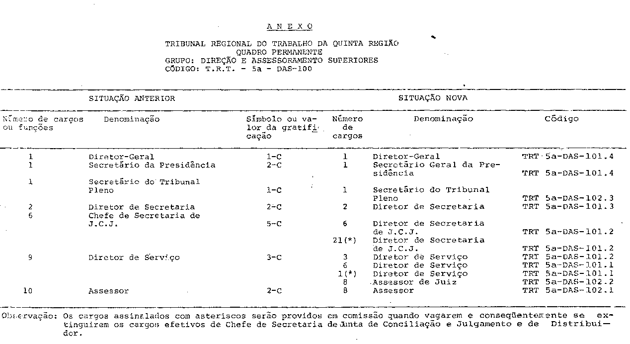 Art. 7º Ficam transformados, reclassificados e criados Quadro Permanente do Tribunal Regional do Trabalho da Quinta Região, os cargos especificados no anexo.