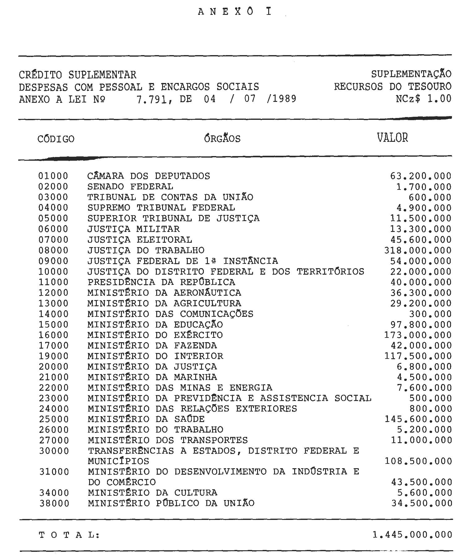 Art. 1º Fica o Poder Executivo autorizado a abrir, ao Orçamento Fiscal da União, (Lei nº 7.715, de 3 de janeiro de 1989), créditos suplementares até o limite de NCz$ 1.445.000.000,00 (um bilhão, quatrocentos e quarenta e cinco milhões de cruzados novos), para atender despesas com pessoal e encargos sociais, conforme indicado no Anexo I desta Lei.