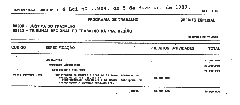 Art. 1º. É o Poder Executivo autorizado a abrir ao Orçamento Fiscal da União (Lei nº 7.715, de 3 de janeiro de 1989)o crédito especial, até o limite de NCz$ 30.000.000,00 (trinta milhões de cruzados novos),de conformidade com a programação constante do Anexo I desta Lei.