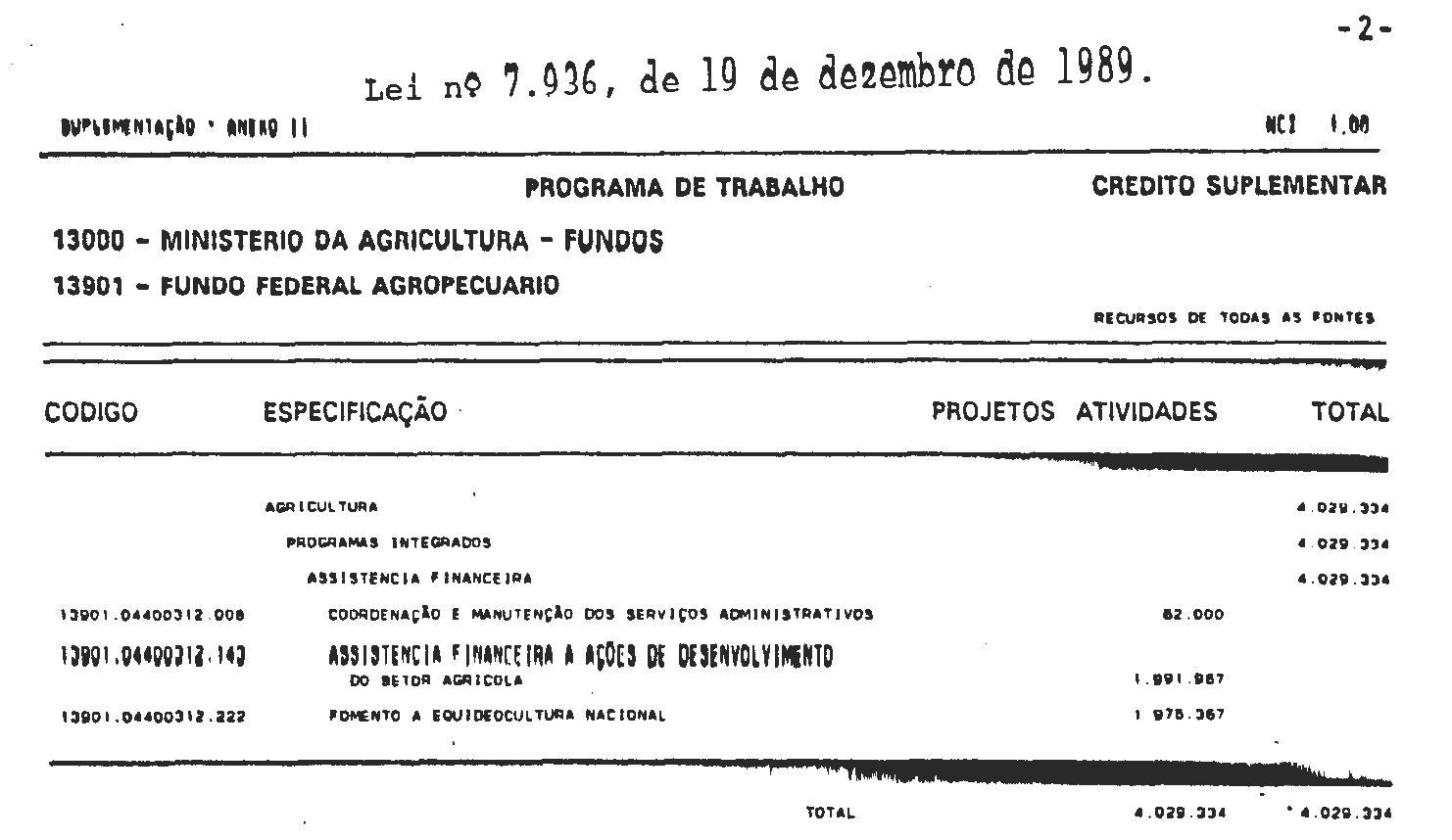 Art. 1° É o Poder Executivo autorizado a abrir ao Ministério da Agricultura o crédito suplementar de NCz$ 4.029.334,00 (quatro milhões, vinte e nove mil, trezentos e trinta e quatro cruzados novos), para a programação constante dos Anexos I e II desta Lei.