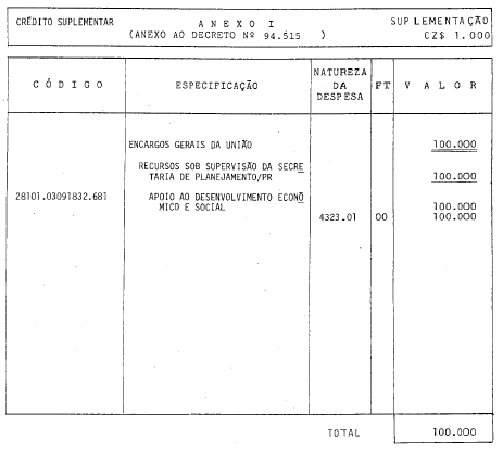 Abre a Encargos Gerais da União - Recursos sob Supervisão da Secretaria de Planejamento/PR, o crédito suplementar de CZ$ 100.000.000,00, para reforço de dotação consignada no vigente Orçamento.