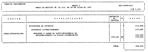 Art. 1° Fica aberto ao Ministério do Interior, em favor de Entidades Supervisionadas, o crédito suplementar de CZ$ 220.000.000,00 (duzentos e vinte milhões de cruzados), para reforço de dotação orçamentária indicada no Anexo I deste Decreto.