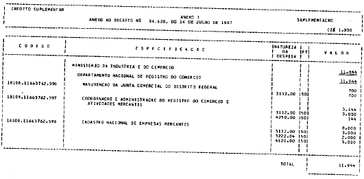 Abre ao Ministério da Indústria e do Comércio, em favor do Departamento Nacional de Registro do Comércio, o crédito suplementar de CZ$ 11.844.000,00, para reforço de dotações orçamentárias consignadas no vigente Orçamento.