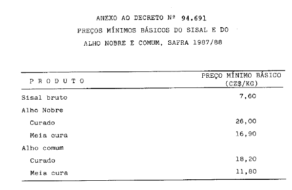 Art. 1° São fixados os preços mínimos básicos para o sisal e o alho nobre e curado, safra de 1987/88, conforme tabela anexa.