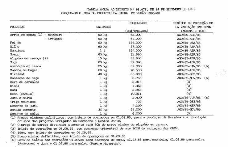 Art. 1º São fixados os preços-base para produtos agrícolas da safra de verão 1985/86, conforme tabela anexa.