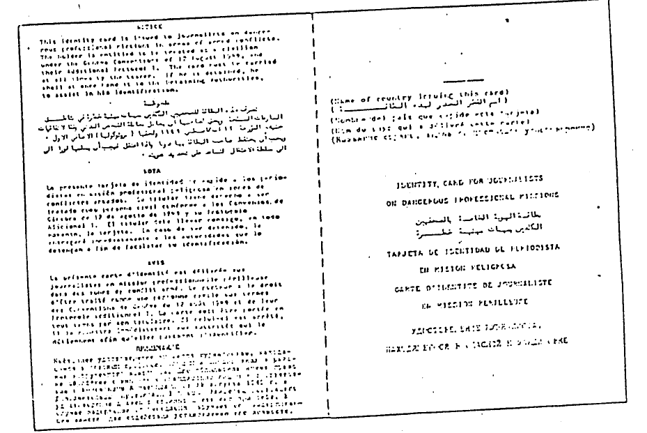 O titular desta carteira goza da proteção estipulada nas Convenções de Genebra de 12 de agosto de 1949 e no Protocolo adicional às Convenções de Genebra de 12 de agosto de 1949, relativo à proteção das vítimas dos conflitos armados internacionais (Protocolo I), na qualidade de ..............................................................................................................................................................................................................................................