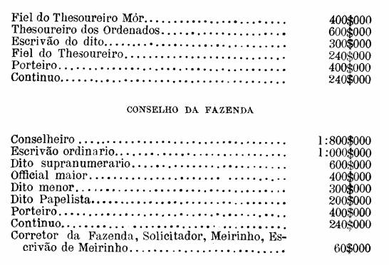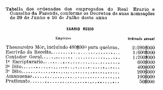 IV. Será composto o dito Conselho da Fazenda de um Presidente, que será sempre o do meu Real Erario, e dos Conselheiros que eu for servido nomear: havendo unicamente para o expediente delle um Escrivão Ordinario, e outro Supernumerario que sirva nos impedimentos do Ordinario, por quem ordeno se expeçam nos dias que não forem Santos ou feriados, todos os negocios ; um Official maior, outro menor, dous Papelistas, um Praticante, e um Official de Registro em cada repartição, assim do assentamento, como do expediente, um Porteiro do Conselho, dous Continuas, um Meirinho e seu Escrivão, um Solicidador, e um Corretor da Fazenda; vencendo os ditos Ministros e Officiaes, bem como os do meu Real Erário, os ordenados que eu pelos Decretos das suas nomeações for servido estabelecer aos ditos empregos nesta Capital, além dos emolumentos que por Lei, Ordem ou Regimento lhes competirem.