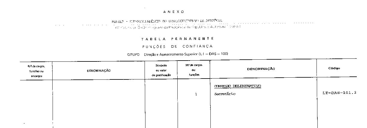 Art . 1º, Fica criada uma função de confiança, na forma do anexo deste decreto, para composição da Categoria Direção Superior, código: LT-DAS-101, do Grupo-Direção e Assessoramento Superiores, código: LT-DAS-100, da Tabela Permanente da Superintendência do Desenvolvimento da Amazônia.