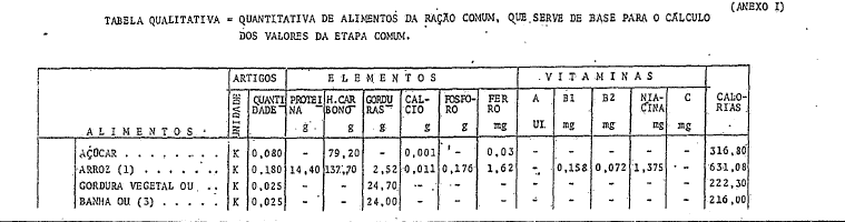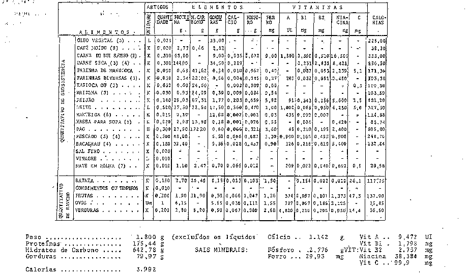 1 - A ração estabelecida na presente tabela tem por fim compensar o desgaste orgânico de um adulto com o peso médio de 70 quilos, submetido a trabalho em clima frio. A administração de cada OM providenciará as alterações nas quantidades de gorduras e hidrocarbonados, diminuindo aquelas e aumentando estes, segundo as necessidades impostas pelos climas quentes e temperados.