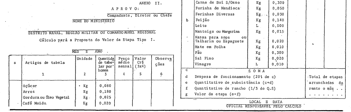 3 - As espécies e quantidades dos artigos constantes desta tabela representam apenas indicações e bases gerais para efeito de fornecimento e pelas quais serão feitos os cálculos para fixação dos valores da etapa (Artigo 90 da Lei Nº 5.787, de 27 de junho de 1972- Lei de remuneração dos Militares).