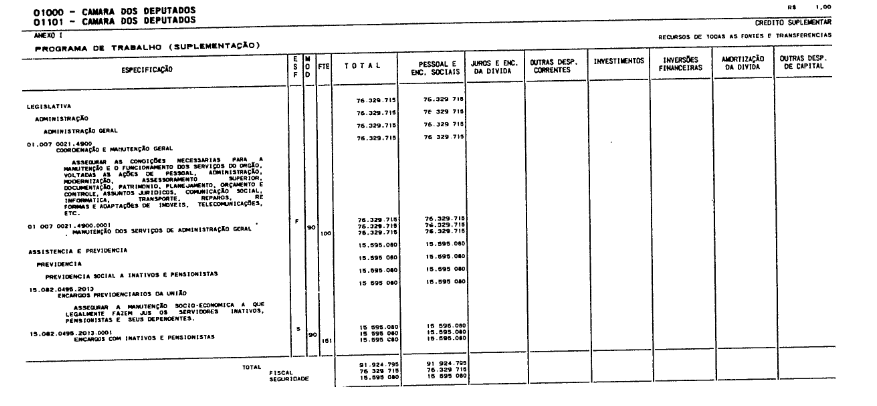 Abre aos Orçamentos Fiscal e da Seguridade Social da União crédito suplementar no valor de R$ 91.924.795,00, em favor da Câmara dos Deputados, para reforço de dotações consignadas no vigente orçamento. |