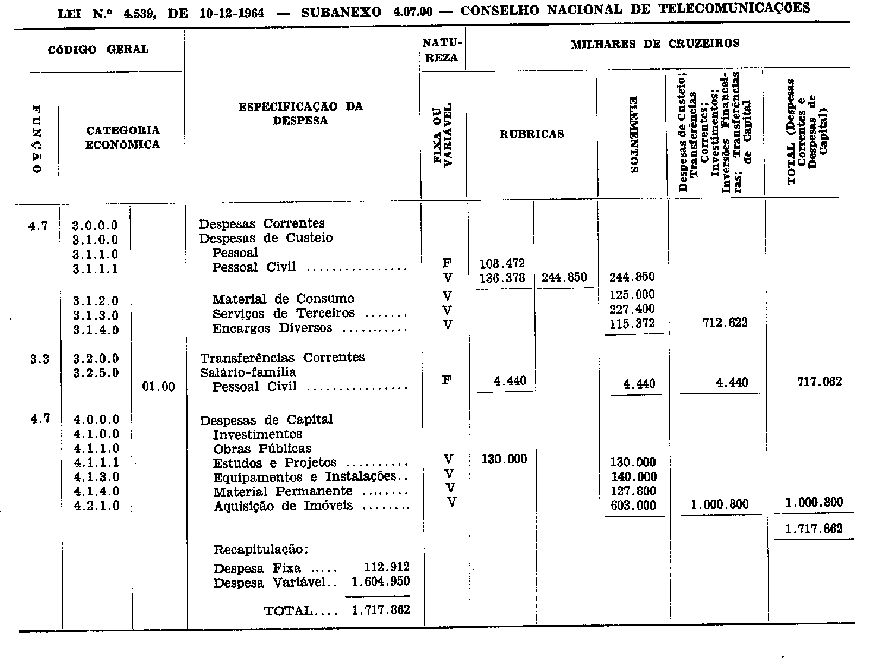 Modifica, sem aumento de despesas, distribuição de dotações consignadas na Lei nº 4.539, de 10 de dezembro de 1964, na parte que se refere ao subanexo do Conselho Nacional de Telecomunicações. |