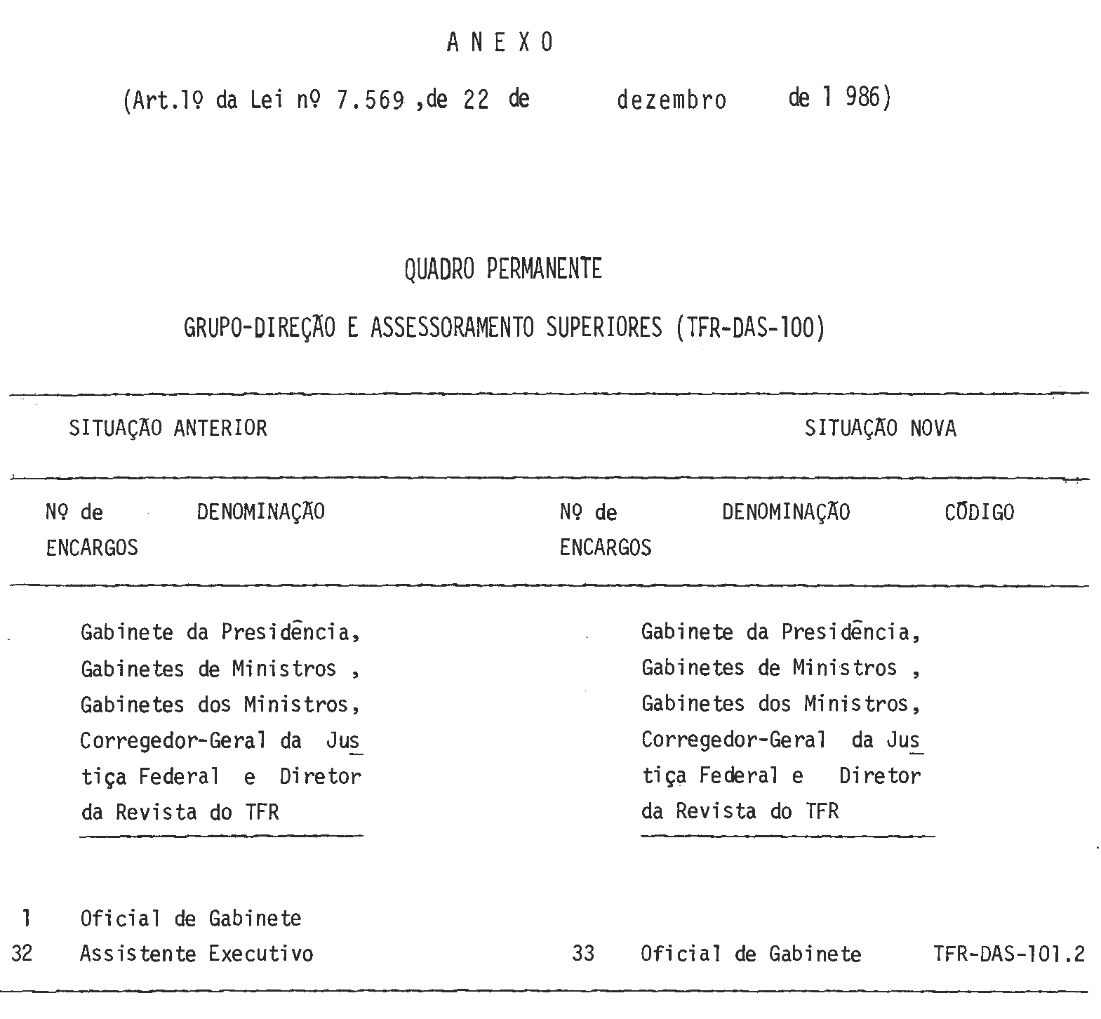 Art. 1º Ficam transformados, na forma do Anexo a esta lei, encargos de representação de gabinete em cargos de provimento em comissão, que integrarão a Categoria de Direção Superior, Código TFR-DAS-101, do Grupo-Direção e Assessoramento Superiores, Código TFR-DAS-100, do Quadro Permanente da Secretaria do Tribunal Federal de Recursos.