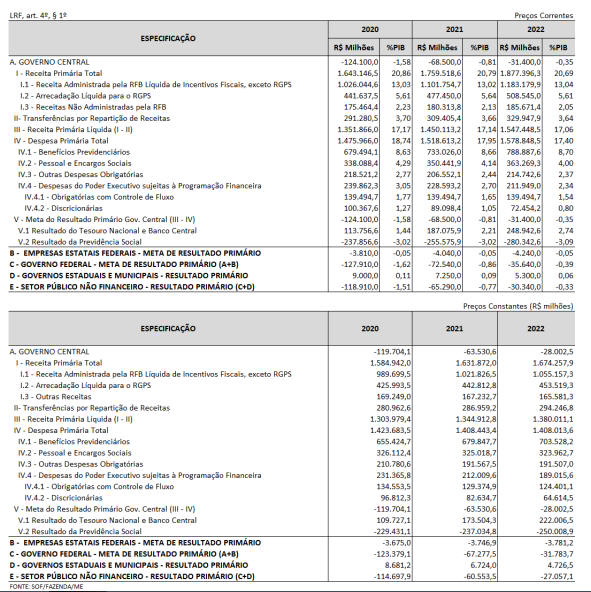 “Art. 2º A elaboração e a aprovação do Projeto de Lei Orçamentária de 2020 e a execução da respectiva Lei deverão ser compatíveis com a obtenção da meta de deficit primário de R$ 124.100.000.000,00 (cento e vinte e quatro bilhões e cem milhões de reais) para os Orçamentos Fiscal e da Seguridade Social e de R$ 3.810.000.000,00 (três bilhões oitocentos e dez milhões de reais) para o Programa de Dispêndios Globais, conforme demonstrado no Anexo de Metas Fiscais constante do Anexo IV a esta Lei.