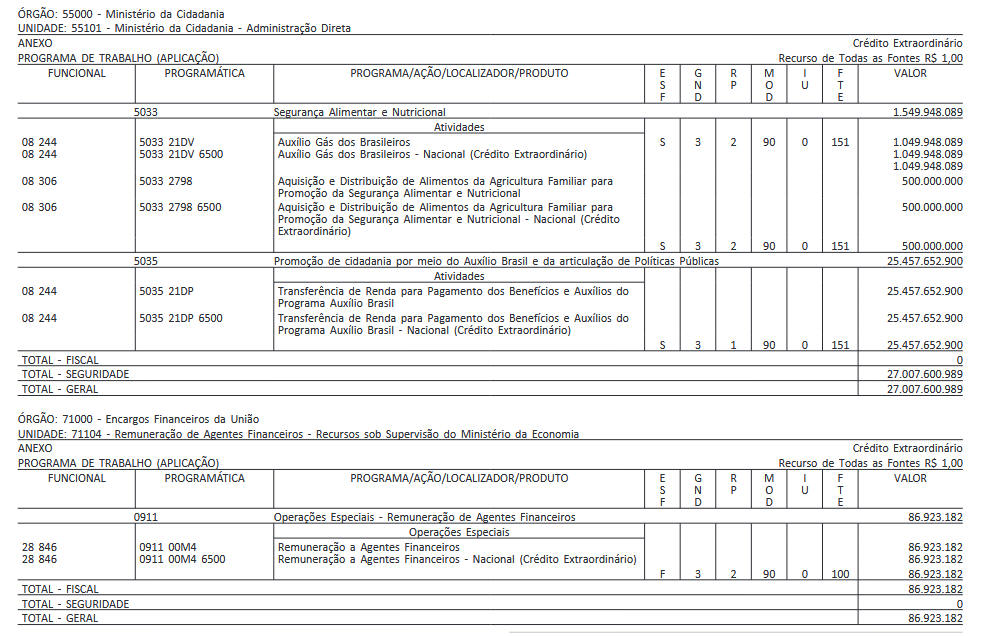 Abre crédito extraordinário em favor do Ministério da Cidadania e de Encargos Financeiros da União, no valor de R$ 27.094.524.171,00 (vinte e sete bilhões, noventa e quatro milhões, quinhentos e vinte e quatro mil, cento e setenta e um reais), para o fim que especifica. |