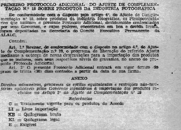 CONSIDERANDO que os Plenipotenciários da Argentina, do Brasil e do México, com base nos dispositivos acima citados, assinaram em Montevidéu, no dia 8 de dezembro de 1972, o Primeiro Protocolo Adicional do Ajuste de Complementação nº 18 sobre produtos da Indústria Fotográfica;